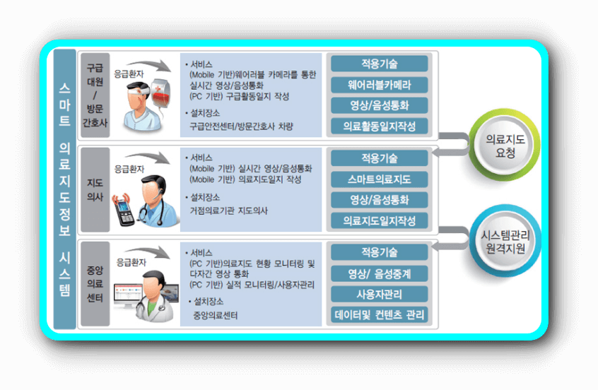 - 현지 의료인이 컴퓨터 화상통신 등 정보통신기술을 활용하여 의료지식이나 기술을 지원하는 서비스 시스템입니다.